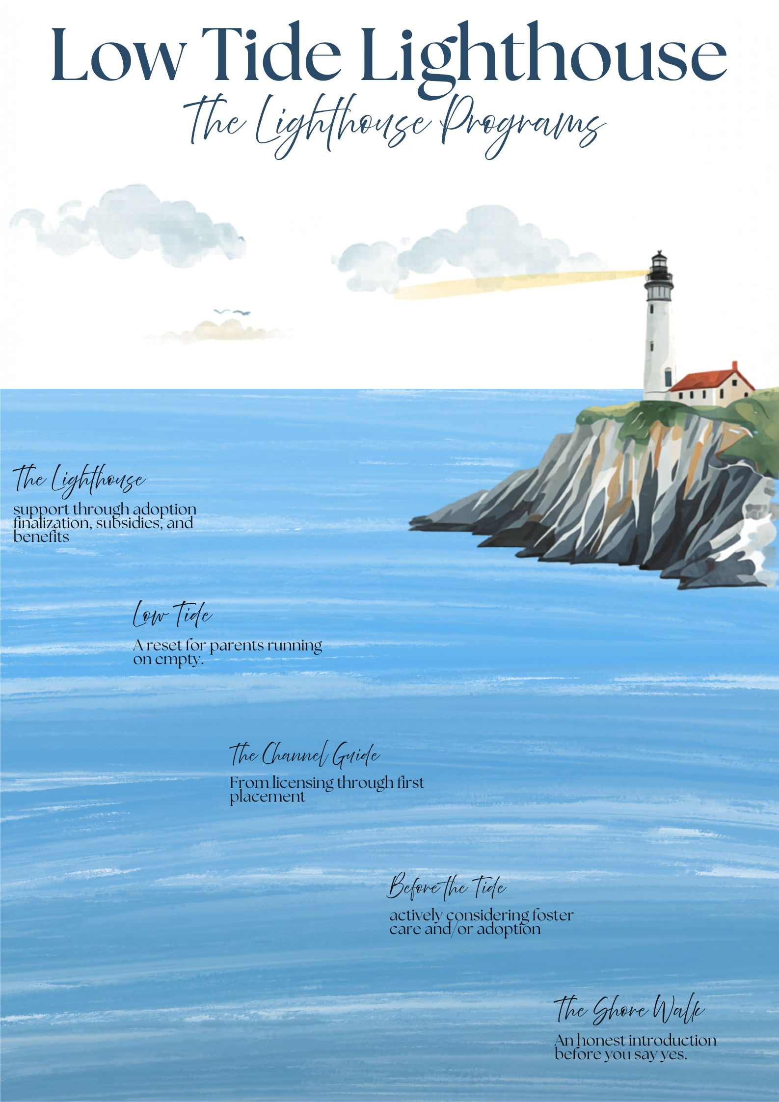 Low Tide Lighthouse provides education, advocacy guidance, and lived-experience support for foster and adoptive families. Services offered are consultative in nature and are not therapy, legal advice, medical care, or licensed social work services.